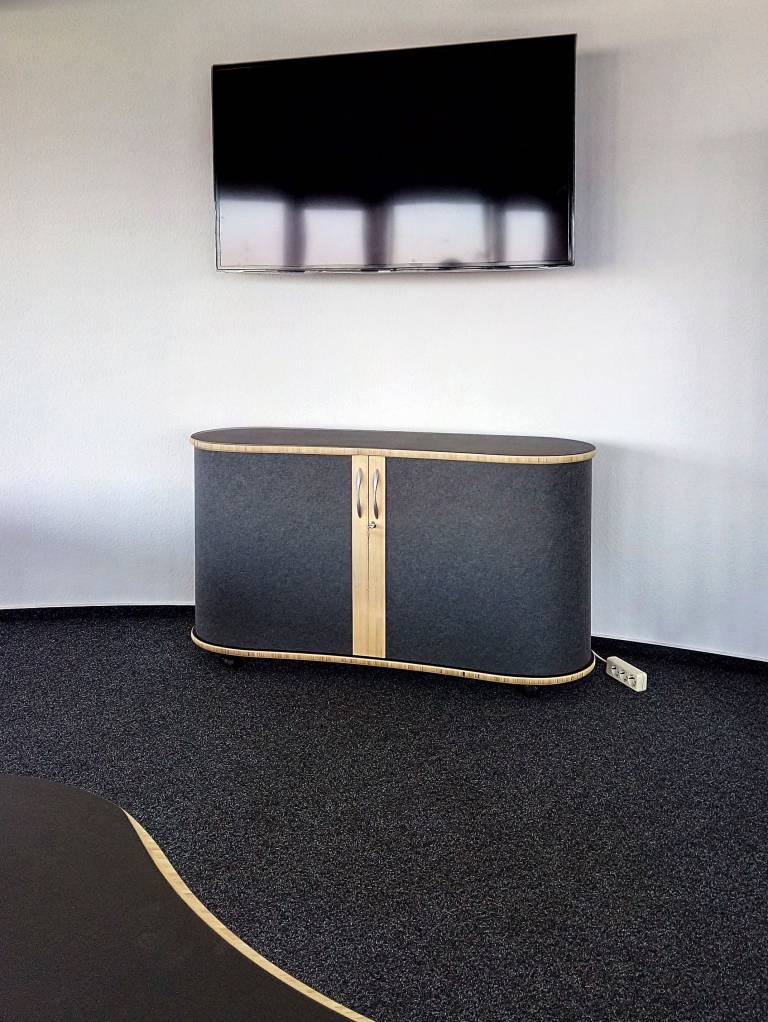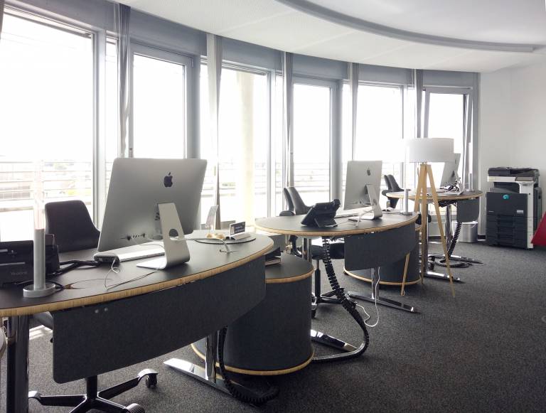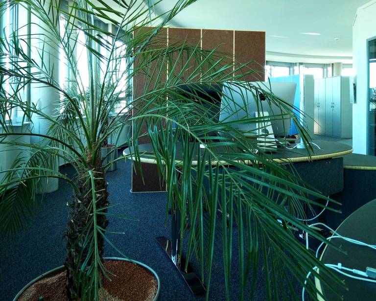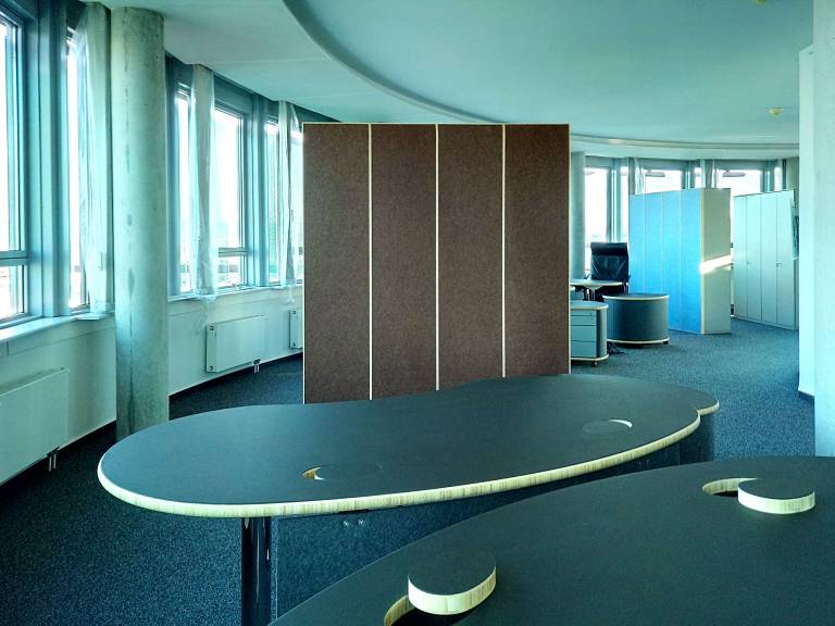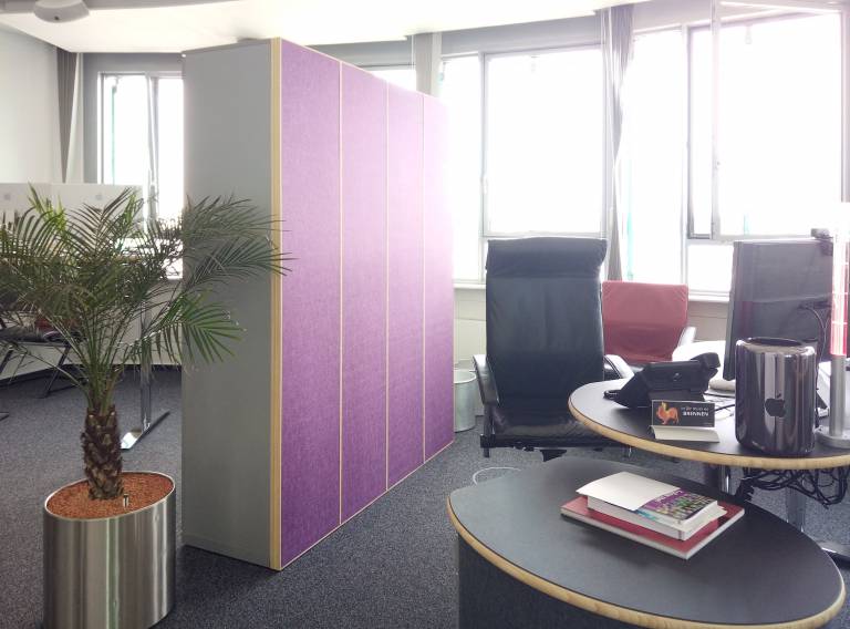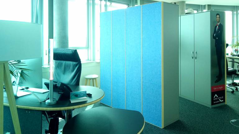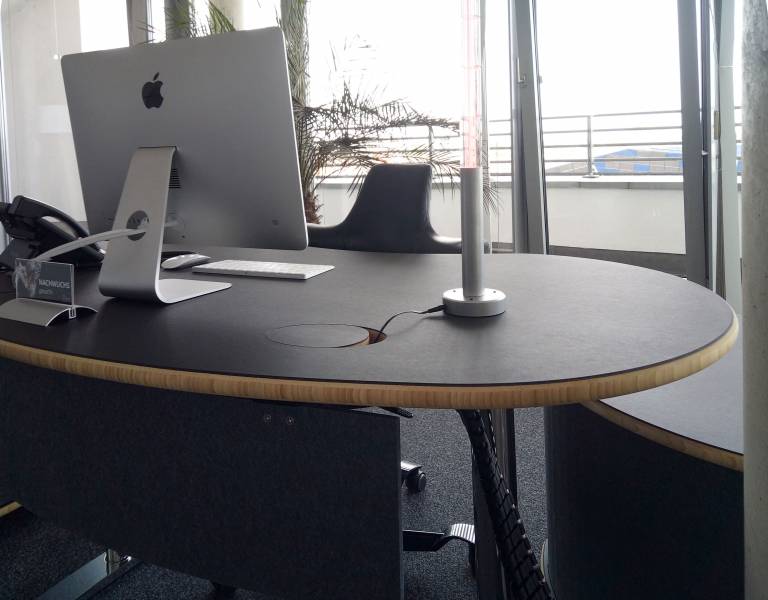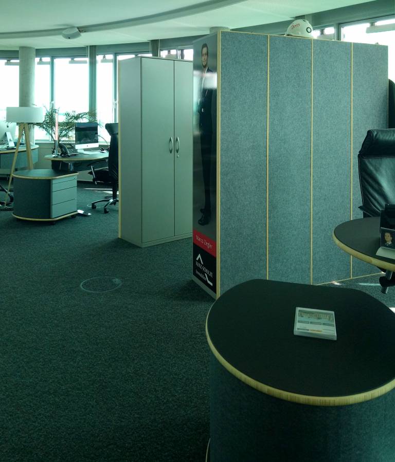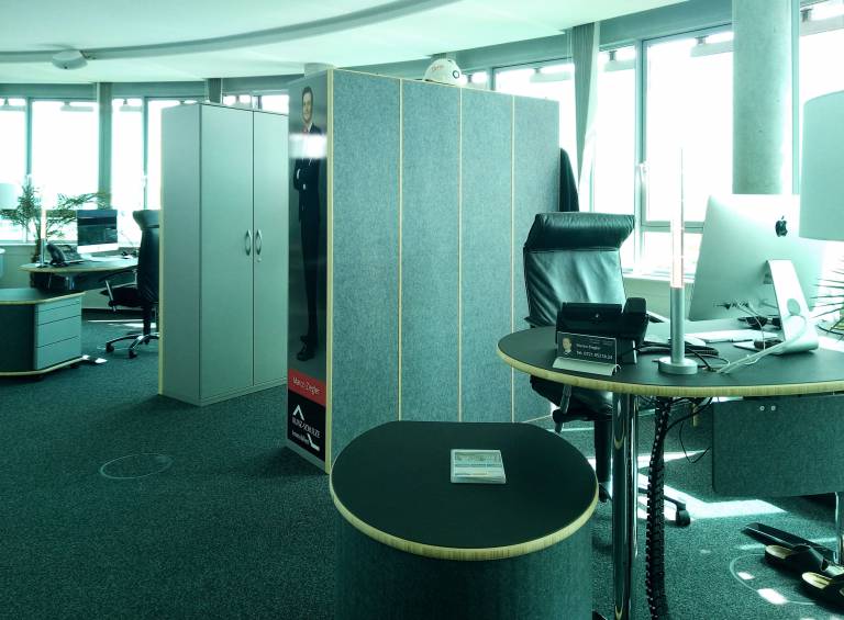 Schon lange mit uns auf dem Weg und immer wieder in sehr angenehmer Zusammenarbeit sind wir mit unserem Kunden Kunz-Schulze Immobilien. Sicher liegt das auch daran, dass Teile seiner Firmenphilosophie wie „Der Mensch steht bei uns im Vordergrund“ oder "wir leben unseren Beruf mit ganzem Herzen“ den unseren so ähnlich sind. Mit diesem Hintergrund machten wir uns an die Arbeit und entwarfen mit dem kreativen Team von Kunz Schulze Immobilien zusammen, ein sehr edles, modernes und lebendiges Büro, welches bis hin zu den eingesetzten Vital-Office (Möbel) Produkten das Firmenbild spürbar macht. "Die Qualität unserer Arbeitsumgebung bestimmt die Qualität unserer Arbeit" - Unsere ergonomischen Tische wurden aus einer Kombination von nachhaltigem massivem Bambus und Linoleum gefertigt, Die benötigten Aktenschränke erhielten eine schlichte Dekorfläche und wurden einseitig mit einer Bambusrahmen-/Akustik 3d-frames Konstruktion beplankt, um gleichzeitig ein angenehm raumakustisches Klima zu schaffen. Als zusätzliche schallabsorbierende Elemente wurden unsere Akustikmatten in Rollcontainern sowie Sichtschutzblenden der Schreibtische verarbeitet. Große Pflanztröge sorgen für ein gesundes Raumklima.