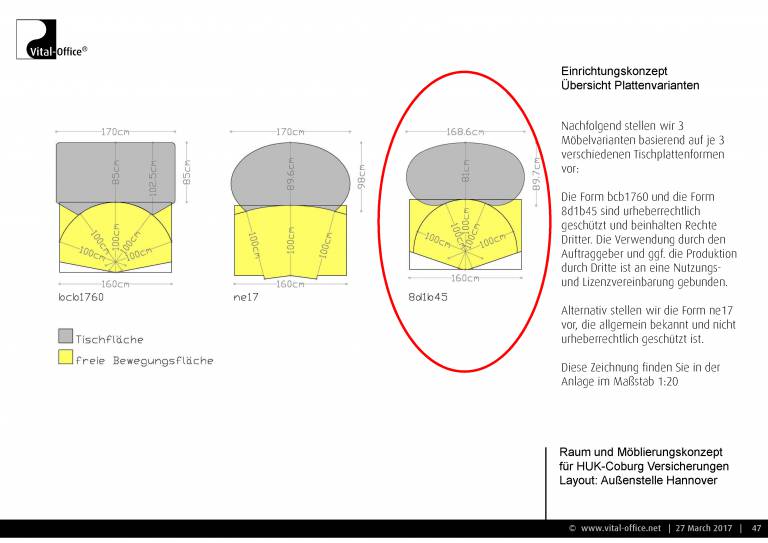 Insbesondere bei runden Tischen mit der Funktion des Drehens innerhalb der Schreibtischplatte ist darauf zu achten, dass keine Armlehnen die Drehbewegung unterbinden und keine scharfen Rückenlehnen die Schreibtischkanten beschädigen.