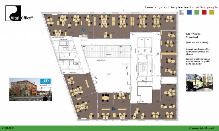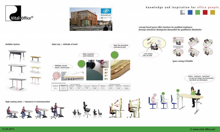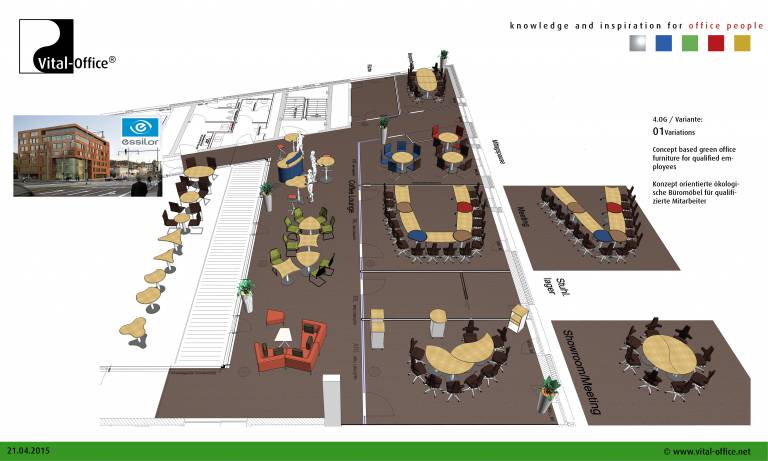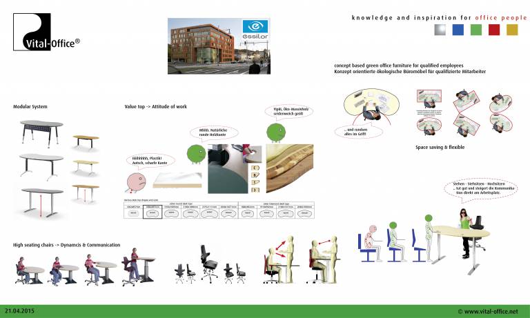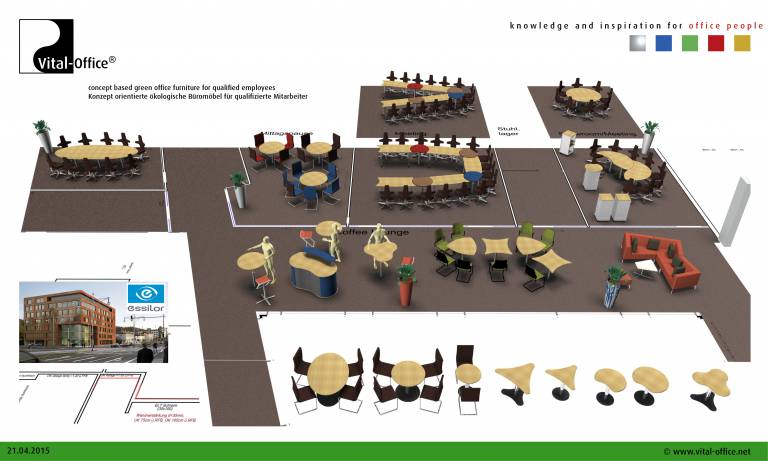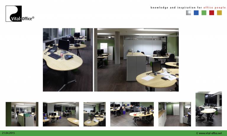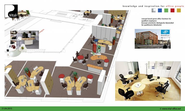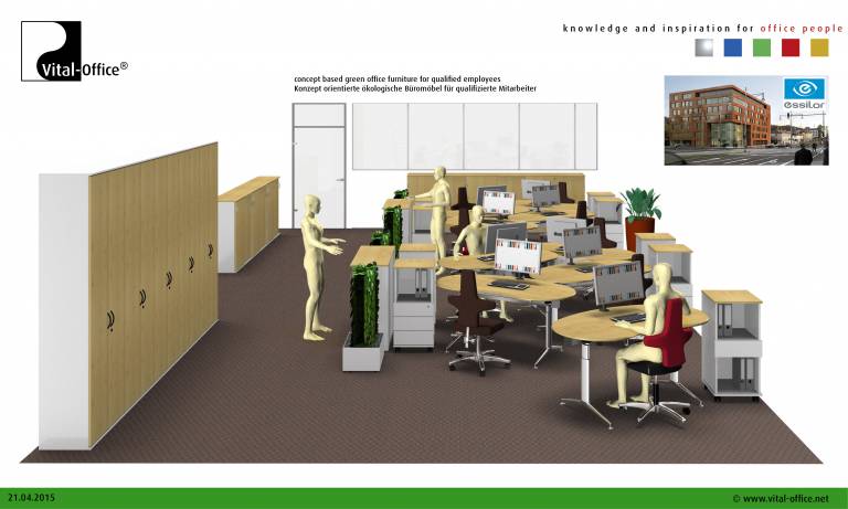 Unterschiedliche Planungslösungen für Essilor in Freiburg sind in Zusammenarbeit mit unserer FengShui Beraterin und Partnerin Frau Silke Sumana Körbs entstanden. Standard“ und „Vertikal Space Plus“ sind gelungene Bespiele dafür, dass sich Gegensätze anziehen können. Schlichte rechteckige Sideboards unterstreichen die Wirkung der ergonomischen Vital-Office Tische und umgekehrt. Bei Vertikal Space Plus ersetzen zudem Caddys auf Rollen konventionelle Standard Rollcontainer der Mitarbeiter am Arbeitsplatz. Die Caddys sind wahre Organisationstalente, bestehend aus einem Basismodul, das nach Bedarf des Mitarbeiters unterschiedlich mit Schüben und Leerfächern ausgestattet werden kann. Pflanztröge schaffen ein zusätzlich positives Raumklima.