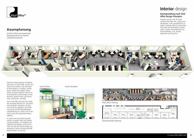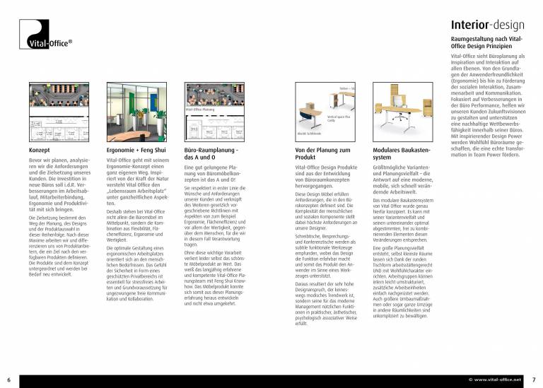 Inspiriert von der Kraft der Natur versteht Vital Office den „Lebensraum Arbeitsplatz“ unter ganzheitlichen Aspekten. Deshalb stehen bei Vital-Office nicht allein die Büromöbel im Mittelpunkt, sondern die Kombination aus Innenarchitektur, Licht, Akustik, Ergonomie und Feng Shui. Vital-Office sieht Büroplanung als Inspiration und Interaktion auf allen Ebenen. Von den Grundlagen der Anwenderfreundlichkeit (Ergonomie) bis hin zu Förderung der sozialen Interaktion, Zusammenarbeit und Kommunikation. Fokusiert auf Verbesserungen in der Büro Performance, helfen wir unseren Kunden Zukunftsvisionen zu gestalten und unterstützen eine nachhaltige Wettbewerbsfähigkeit innerhalb seiner Büros. Mit inspirierender Design Power werden Wohlfühl Büroräume geschaffen, die eine echte Transformation in Team Power fördern.