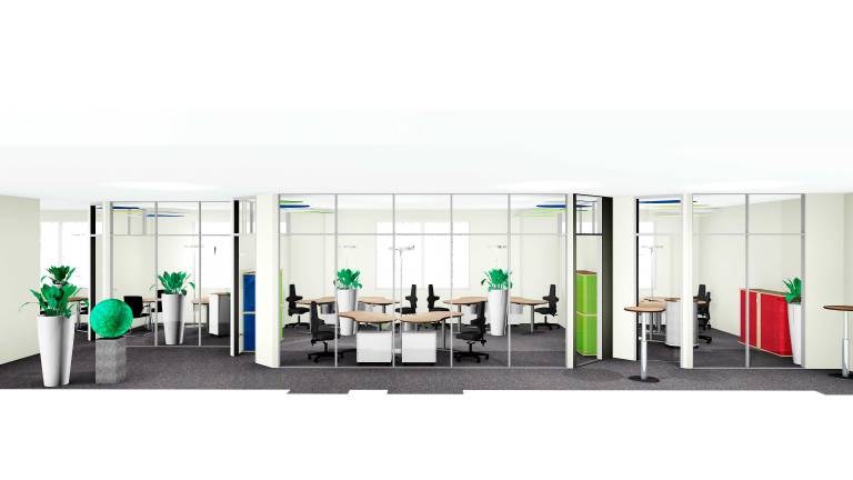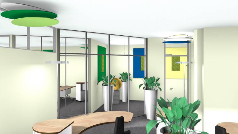 Unser Vital-Office Konzept lässt mittig des Gesamtgrundrisses ein „Herzstück Kommunikation“ entstehen, um das sich die Büros orientierten. Der Flurbereich passt sich den Räumlichkeiten mäanderförmig an, sodass sich für die Nutzer auch dort spannende Räume ergeben. Es wurde eine Trennwand gewählt, welche zu großen Teilen aus Glaselementen beststeht, um möglichst viel Tageslicht einzufangen und die Räumlichkeiten zu bereichern. Da harte Flächen wie Glas den Schall weniger gut aufnehmen können, wurden dreidimensionale Akustikmobiles eingesetzt.