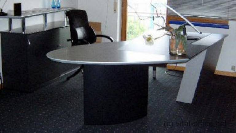 Modern „Team And Work“ work-station for individual distinctiveness. Energetic combination of materials for the work surface with the slightly slanted aluminum rear panel and the elliptical molded column, supports the expression of motivation, lightness and stability.