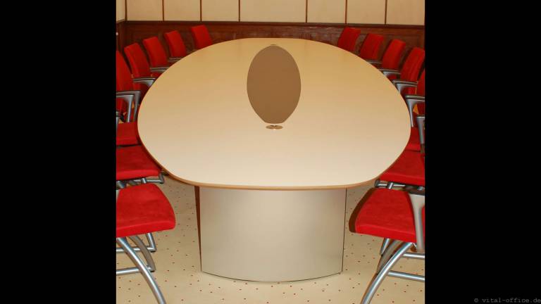 Conference table for 18 persons. Elliptical boat shape.