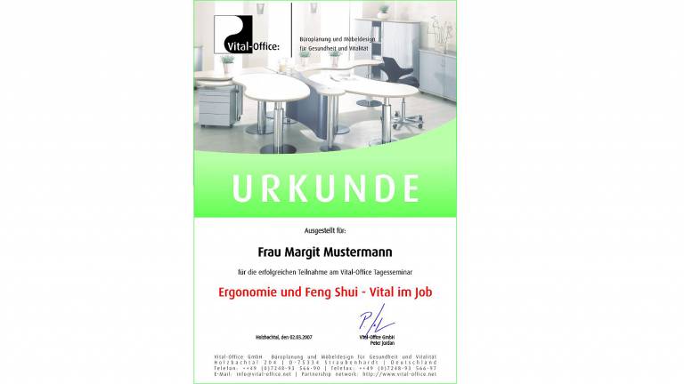 Dieses Seminar ist der Einstieg in die Vital-Office Planungsphilosophie und vermittelt in konzentrierter Form einen Überblick über die Wechsel-Beziehungen von Büroeinrichtung und Mensch anhand Ergonomie, Psychologie, Feng-Shui und heiliger Geometrie.