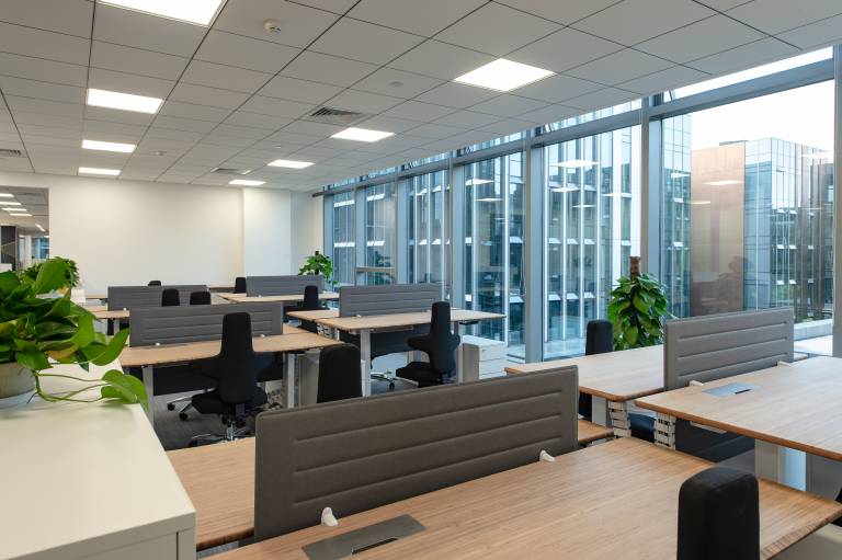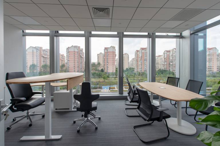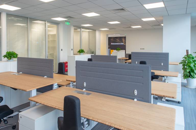 5 years after the furnishing of Jungheinrichs new factory, Vital-Office is again the supplier for Jungheinrichs new HQ and SO. Green bamboo desks are chosen again. Rectangular desk tops with height adjustable bases are added new. And the ergonomic saddle like WEY-chair was choosen again, but in 3rd generation technique and design. Electric installation and plug-in possibilities from top of table and from below table top was a special concern. Acoustic partitions are especially made for height adjustable stand-up desks. The acoustic panel is lifted always by the highest table top. This ensures, that all sticky notes on the screens are always available to the users on both sides.