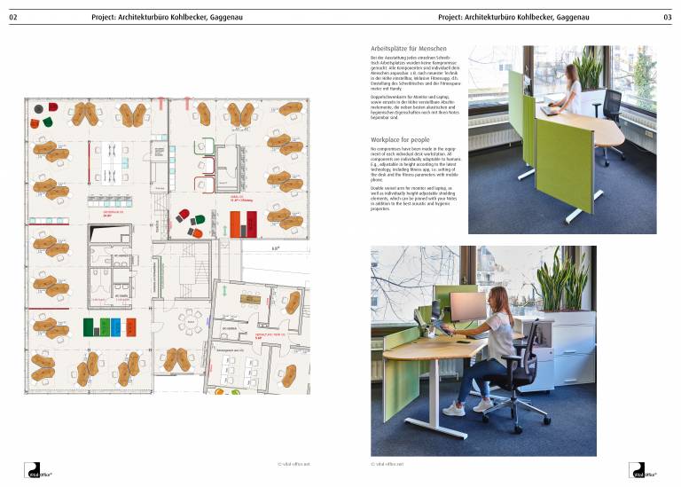 No compromises have been made in the equipment of each individual desk workstation. All components are individually adaptable to humans. E.g., adjustable in height according to the latest technology, including fitness app, i.e. setting of the desk and the fitness parameters with mobile phone.