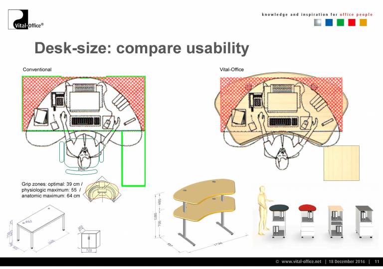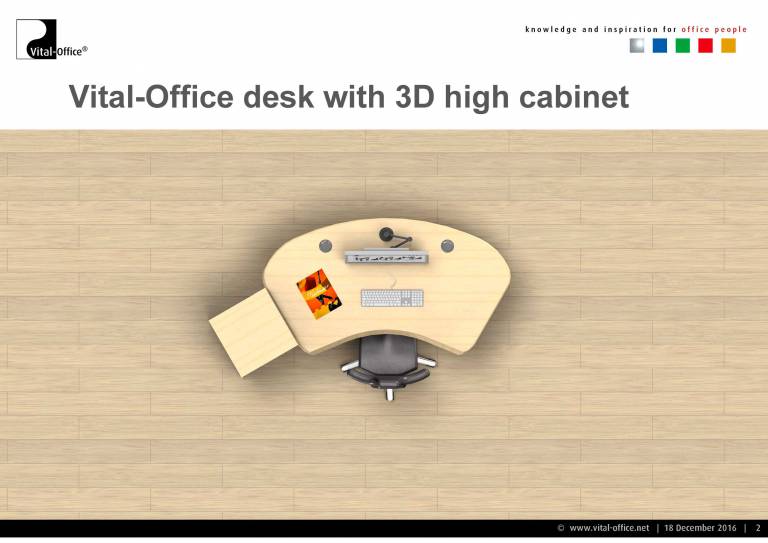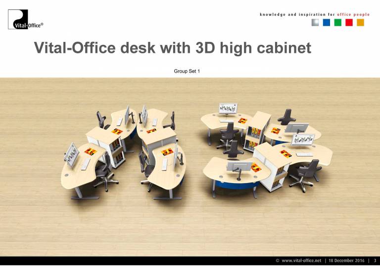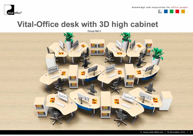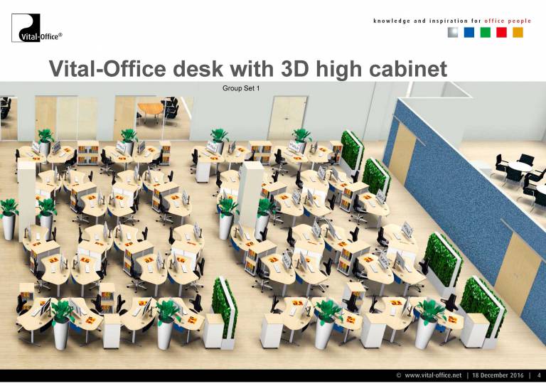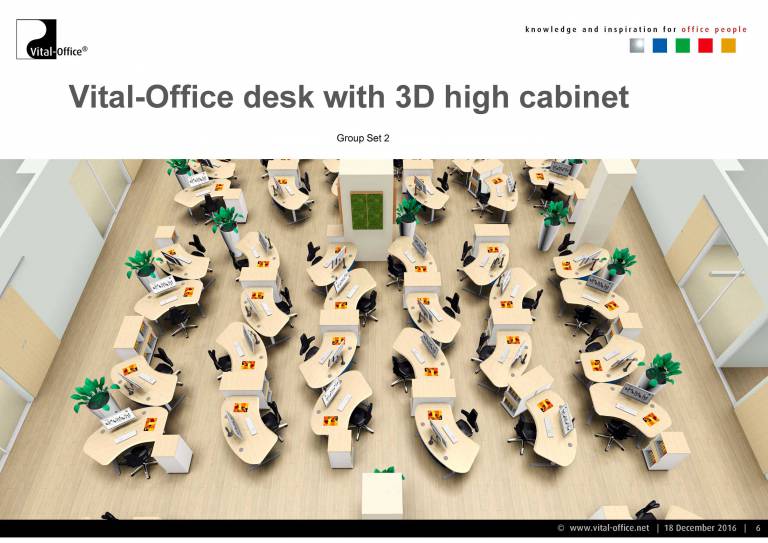 It was hard to fit all required people in the open space. But we did it and the concept is really good. The corridors are wider due to security reason. (In original planning with rectangular tables the corridors are too small. They are only 600mm wide. This is actually not possible due to security reasons. Imagine 96 people need escape with so small corridors.) You now have large table top plus the HIGH 3d cabinet with 2 floor storage for binders PLUS a personal drawer lockable. The 3d high cabinet fits perfect to the height adjustable desks. Good for stand-up, communication at workplace and privacy. Desk size is same as Optima, which we furnished in Jiading (Shanghai). The one wall is with sample design with vitAcoustic 3d frames including real green natural moss elements. They reduce the echo and the green wall parts foster a natural climate.
