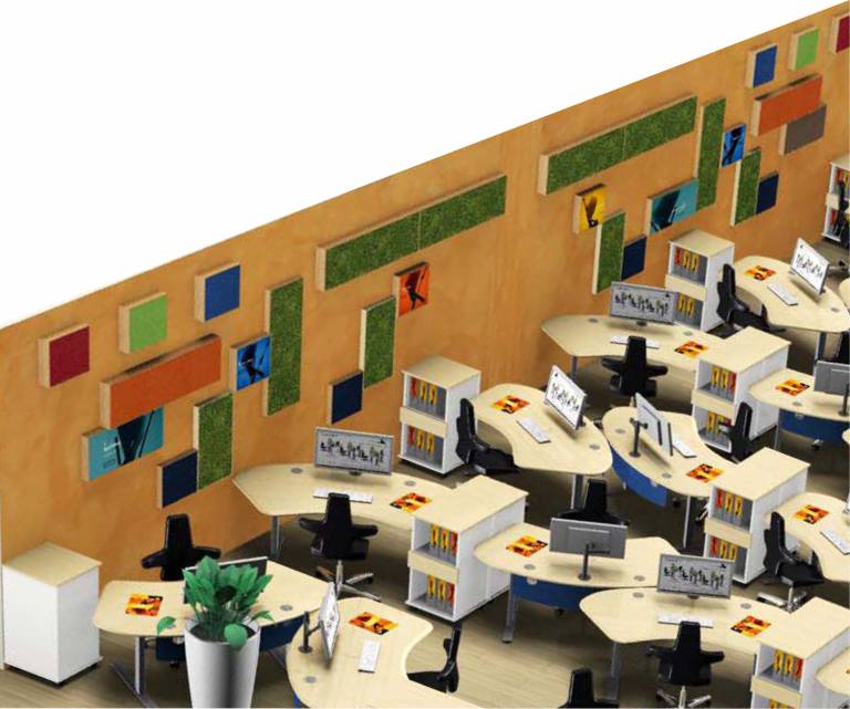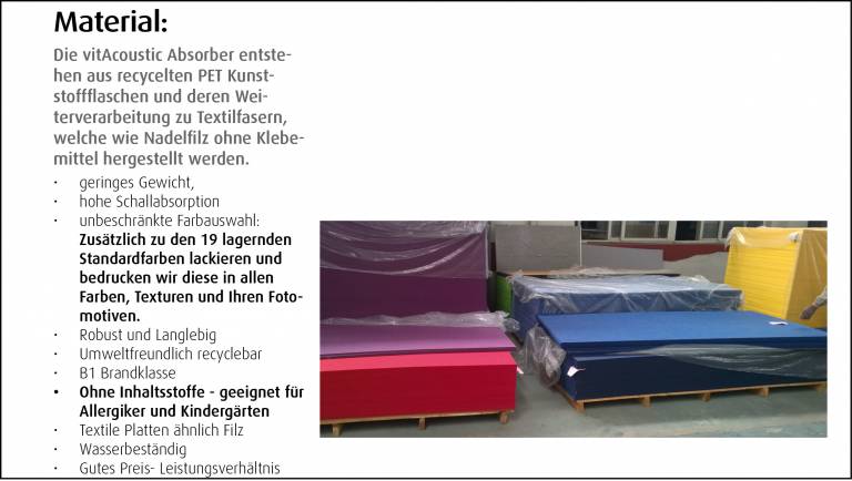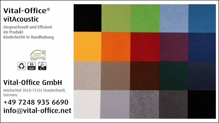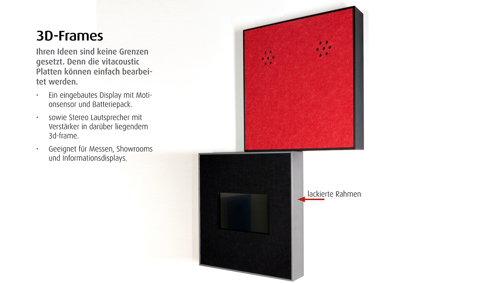 所述vitAcoustic PET吸收板是高吸音,阻燃剂(B1),不敏感于湿气和灵活的用于在3D帧使用。花丝框架由实心竹子制成,有三种尺寸和厚度。因此,可以实现墙体的三维设计效果。