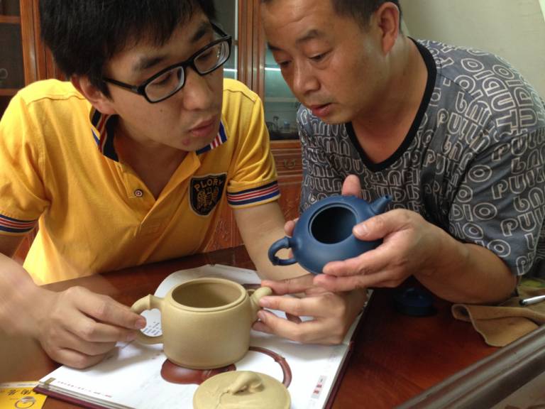 The other store belongs to a famous teapot maker. 2 young women were sitting on the worktable and modelling parts of the teapot. They were learning the task of teapot making. To study these skills you need 2 years learning, while each year you need pay a 20.000 RMB fee plus gifts to your teacher. Only after 2 years you are allowed to make your first complete teapot. The teapots from unknown graduated students are cheaper in price and may lack some advanced techniques of making. Anyway, these pots are already a precious handcrafted valuable teapot. They say, that after 5 years you may become a skilled craftsman, but as usual, not everybody becomes famous. So you can get very good handcrafted teapots at a affordable price and also can get expensive teapots from famous craftsman.